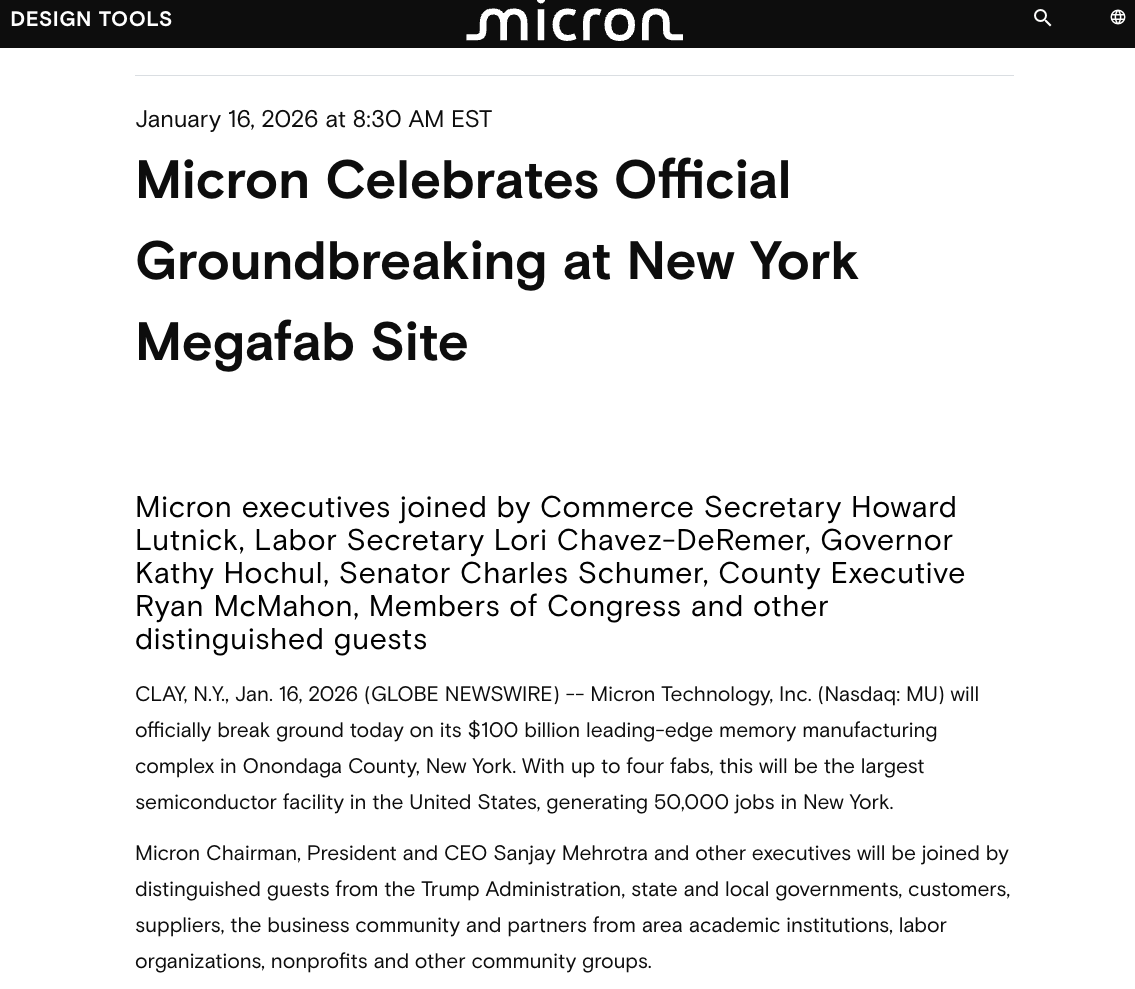 消息面上,公司周五在美国纽约州奥农多加县为投资高达1000亿美元的内存制造综合体举行奠基仪式。公司在公告中确认,该项目将建最多四座晶圆厂,将成为美国最大半导体设施和全球最先进的存储制造基地。该设施计划于2030年投产,产能将在后续10年里逐步爬坡。