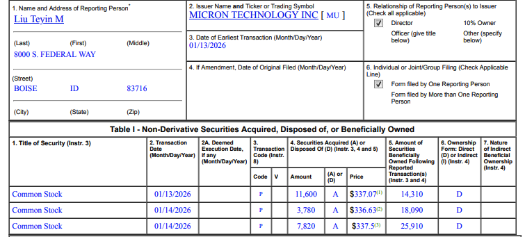 美光科技周四向SEC提交的FORM 4文件显示,刘德音在本周二和周三分3次增持2.32万股美光股票,合计花费782万美元。