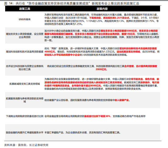 在1月15日国新办发布会上,邹澜明确表示“从今年来看,降准降息还有一定空间”:一是金融机构平均法定准备金率约6.3%,降准仍有余地;二是外部约束方面人民币汇率较稳定、美元处于降息通道,汇率对降息掣肘不强;三是内部约束方面银行净息差已出现企稳迹象,同时此次下调各类结构性货币政策工具利率(再贷款一年期由1.5%降至1.25%)有助于降低银行付息成本、稳定净息差,从而为后续“总量降息”创造条件。我们认为货币政策取向较此前更偏“明确宽松”,后续总量工具(降准、政策利率)落地的概率上升,但节奏仍将取决于信用修复斜率、物价回升动能以及银行息差与汇率的边际约束。