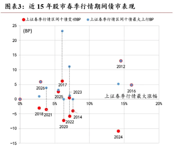 2026年春季行情更可能呈现为“中段加速、宽松预期、成长主导”的组合特征,对债市的影响以靠前的阶段性扰动为主而非趋势性利空。年初股市涨幅较大,短期内利率或被动上行或波动放大,但央行降准与结构性宽松仍处兑现窗口、且主线集中于成长主题,使名义增长与通胀预期难以被系统性抬升,债市缺乏持续上行的宏观基础。历史上类似结构下,利率多在春季行情前半段承压、后半缓和。需要警惕行情是否向周期与稳定板块扩散并形成共振,在此之前,利率更可能维持高位震荡,一季度附近反而更有可能是阶段性高点。