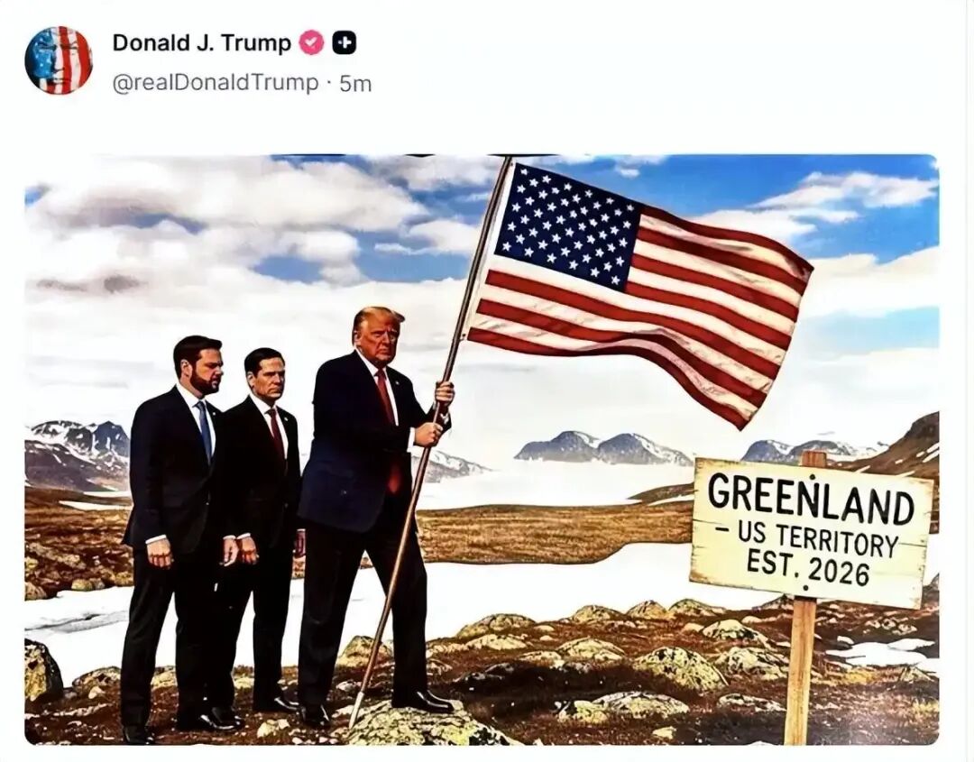据新华社消息,美国总统特朗普20日凌晨在社交媒体上发布图片,他手拿美国国旗登上格陵兰岛,身后站着美国副总统万斯和国务卿鲁比奥,旁边指示牌上写着“格陵兰岛2026年成为美国领土”。
