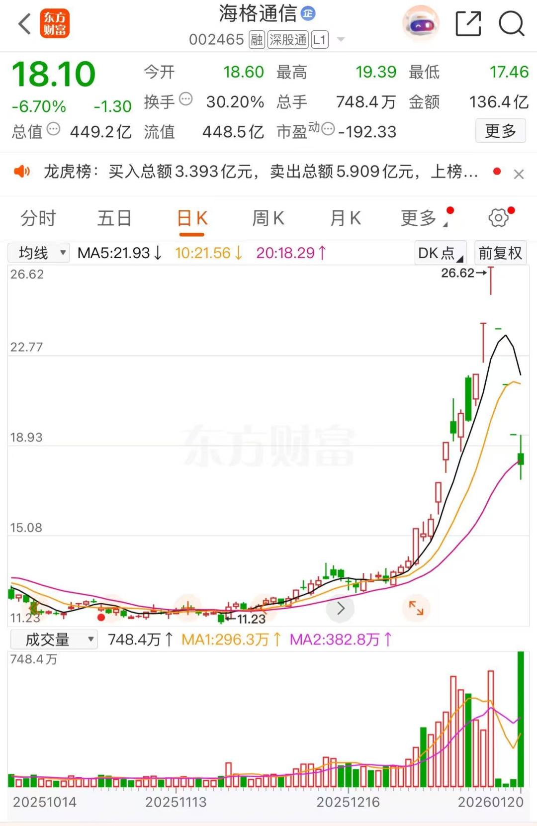 1月20日午后,海格通信股价低开后触及跌停,截至当日收盘,报收18.10元/股,下跌6.7%。