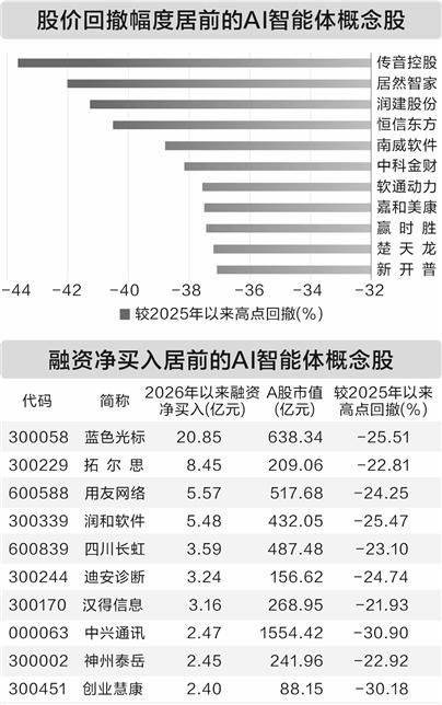 资金流向方面,截至1月19日,上述回撤20%以上的AI智能体概念股中,2026年以来获得融资净买入超1亿元的有17只,如蓝色光标、拓尔思、用友网络、润和软件、四川长虹等。
