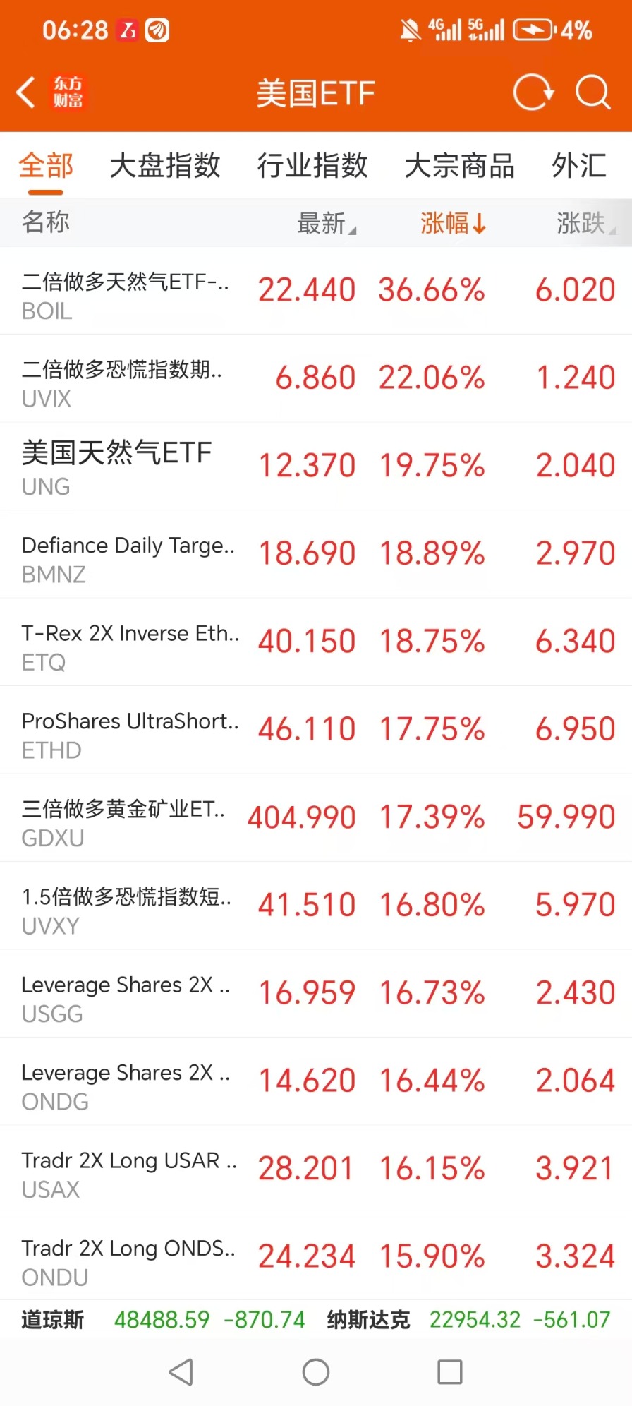 两倍做多彭博天然气ETF-ProShares(BOIL.US) 升36.60%,成交额7.19亿美元。