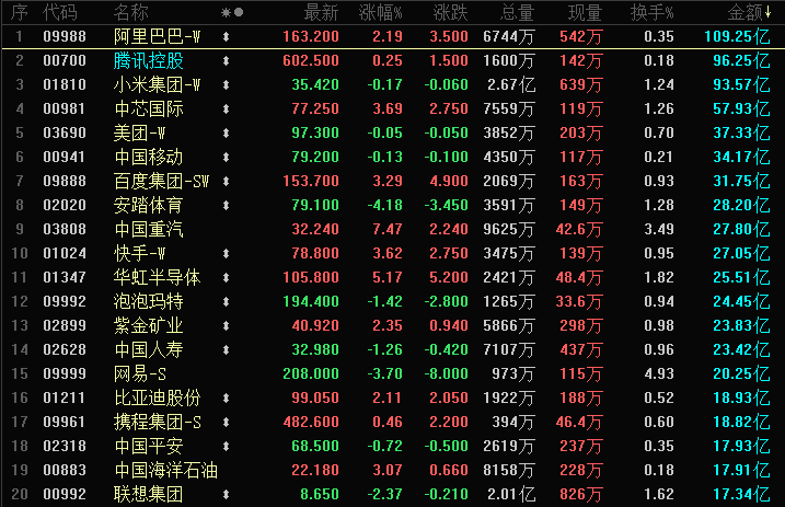 港股成交额前二十