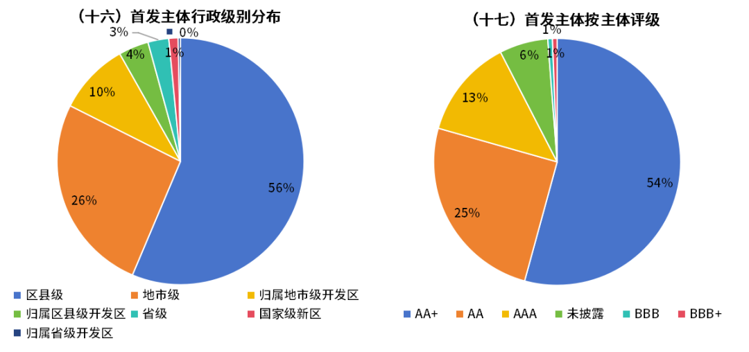 ■行政层级上,首次发债主体以区县级为主,共186家;地市级86家。信用评级方面,AA+级主体最多,共179家;AA级83家;AAA级43家;另有2家为BBB+/BBB级,其余主体暂无评级。