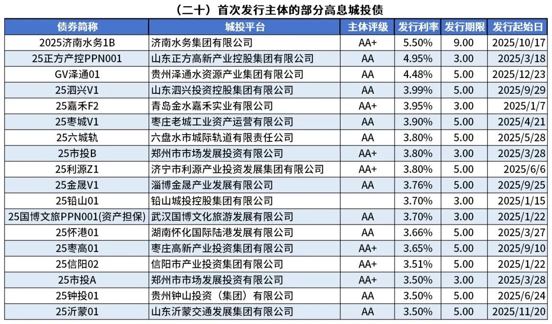 ■利率方面,首次发行城投债的加权平均发行利率为2.56%。部分债券票面利率较高,如济南水务集团有限公司发行的“2025济南水务1B”票面利率为5.50%,山东正方高新产业控股集团有限公司发行的“25正方产控PPN001”票面利率为4.95%。