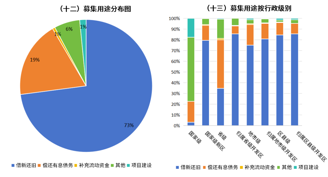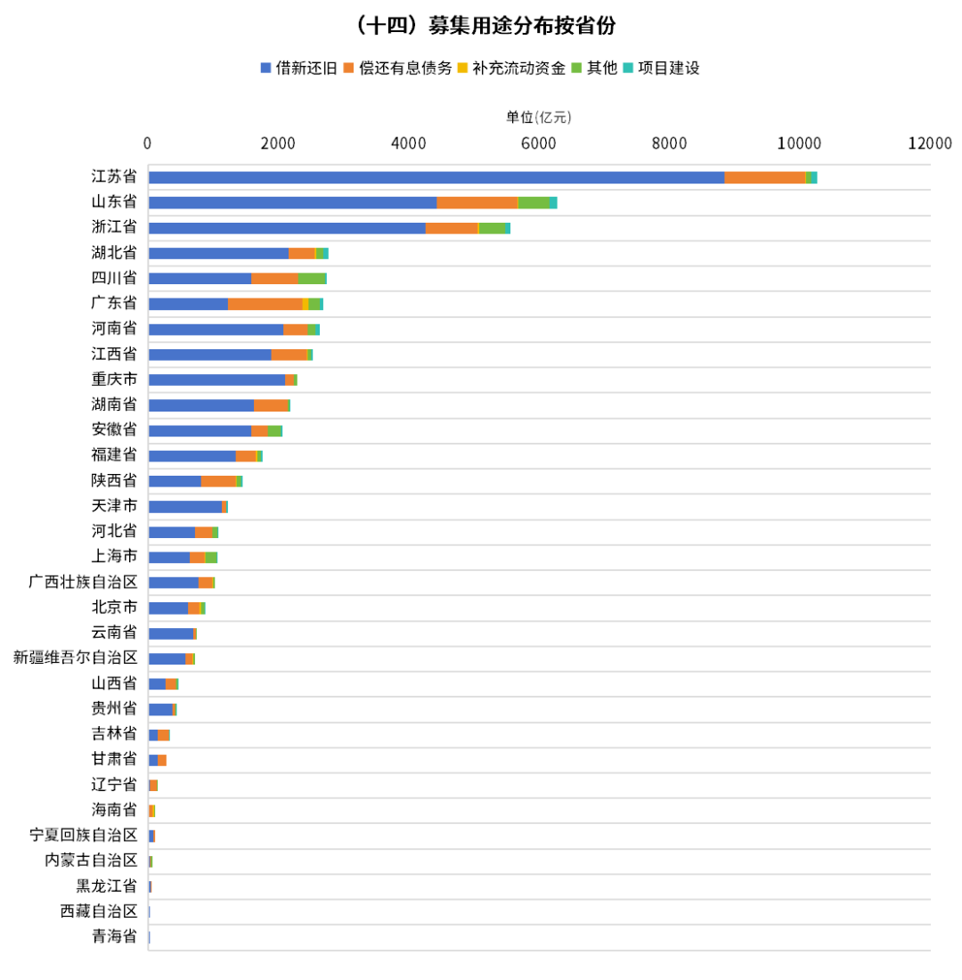募集资金用途方面,用于“借新还旧”的比例高达73%,其中天津、黑龙江等多省该比例超过90%;