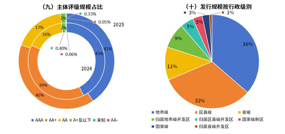 ■从城投债发行主体评级分布看,AAA和AA+级的主体仍是发行主力,发行规模分别为22,430.53亿元和21,948.71亿元,合计占比超过80%。从主体所属行政层级划分,地市级和区县级平台发行规模占主导,分别为20,060.06亿元和17,770.84亿元,合计占比约68.58%。省级开发区主体发行规模同比下降36.48%。