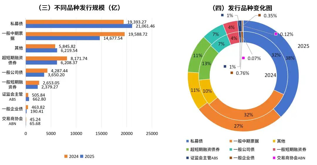 发行品种、期限方面,私募债发行规模超2万亿,同比增加8.6%,一般中期票据则同比减少4911.18亿;城投债中长期发行期限拉长,1年以内的城投债发行规模为748.79亿,同比下降31.17%;