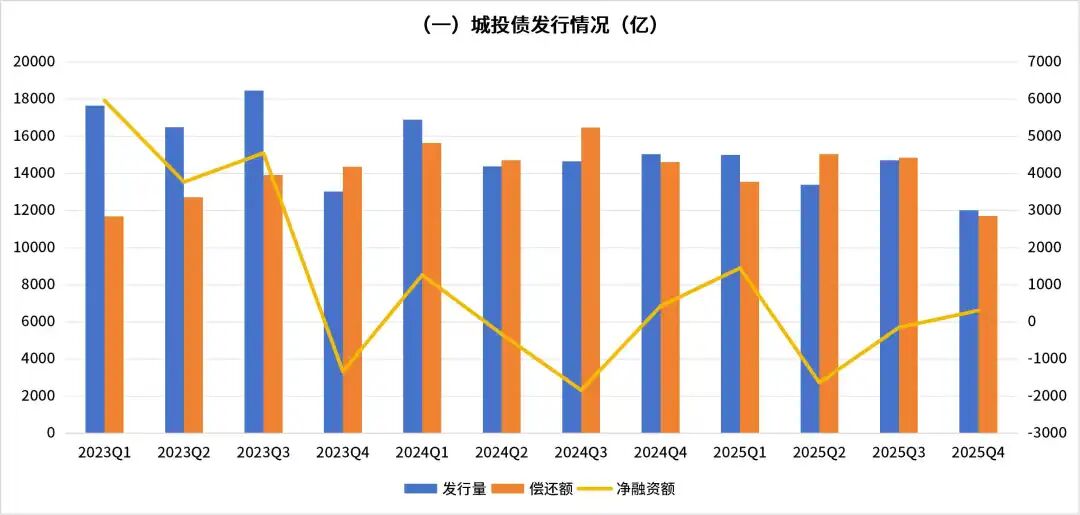 报告显示,2025年,城投债发行规模为55,115.27亿元,同比下降约10%,净融资额为-26.66亿元,近十年来低位,城投债市场从“增量扩张”转向“存量消化”阶段;