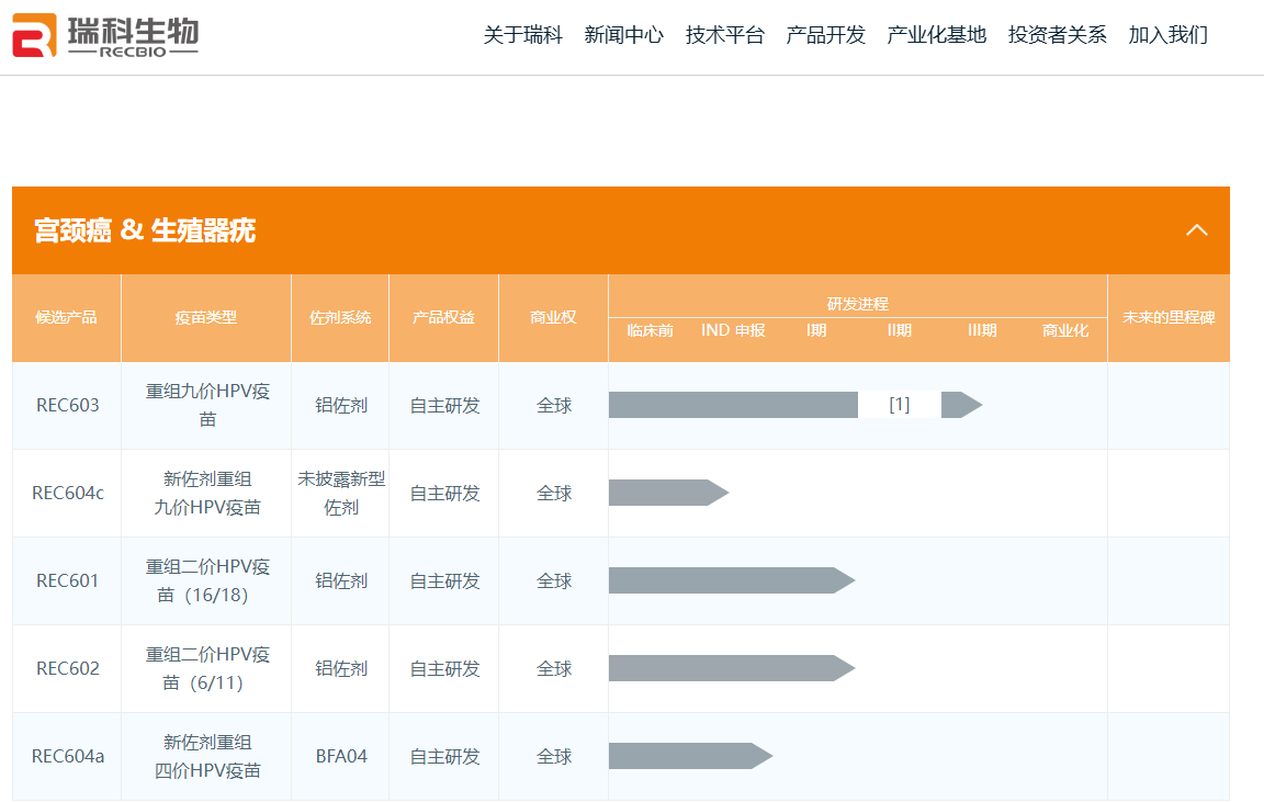 瑞科生物是一家成立超过10年的疫苗公司,2022年登陆港交所时尚无产品实现上市销售。从该公司网站来看,目前其进入商业化的是一款合作研发的新冠病毒疫苗ReCOV,此外进度靠前的是自主研发九价HPV疫苗、带状疱疹疫苗。