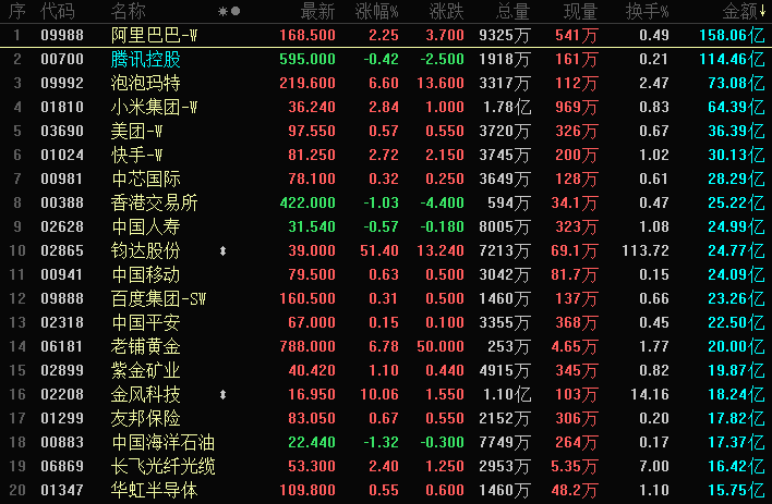 港股成交额前二十