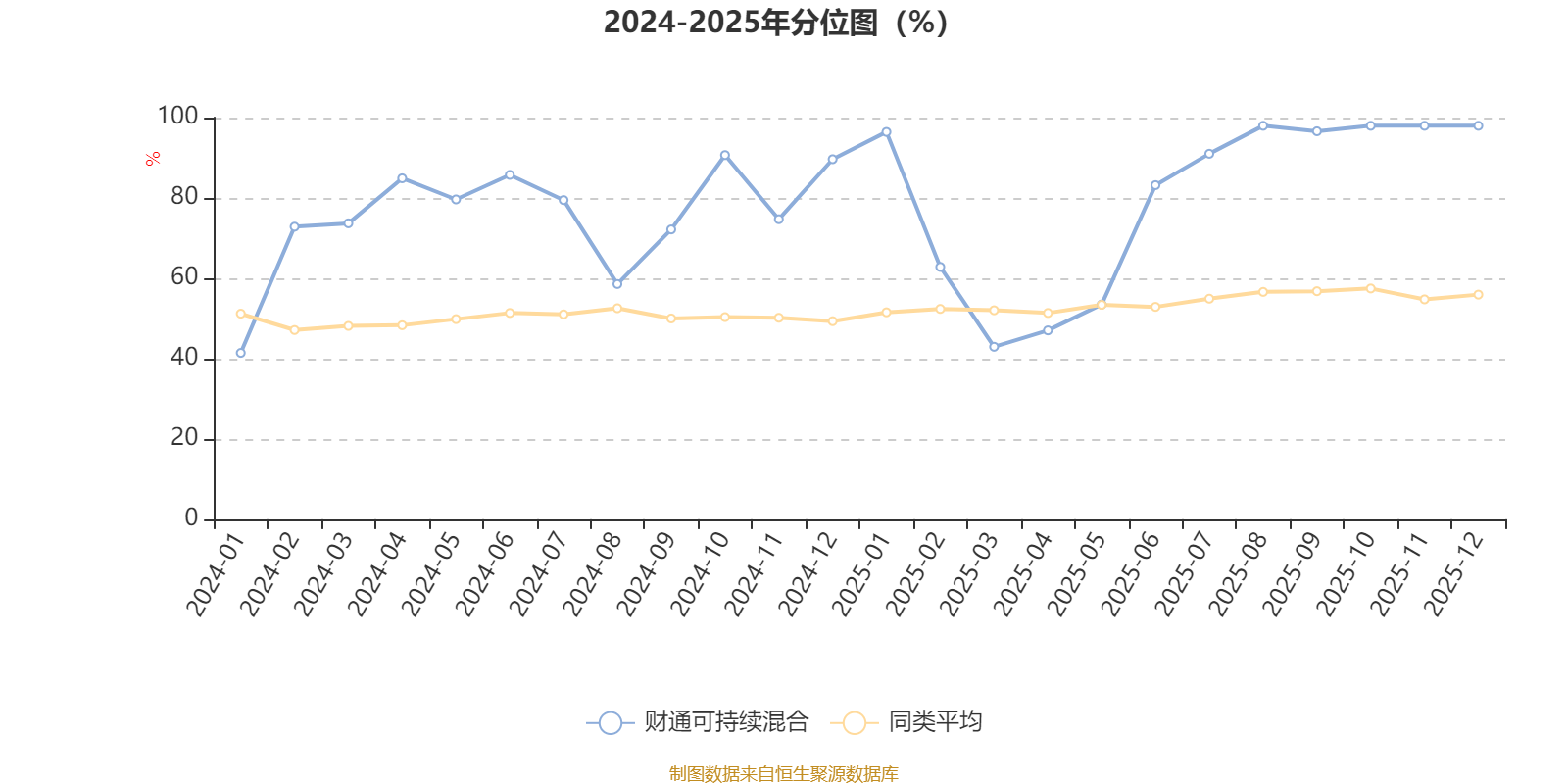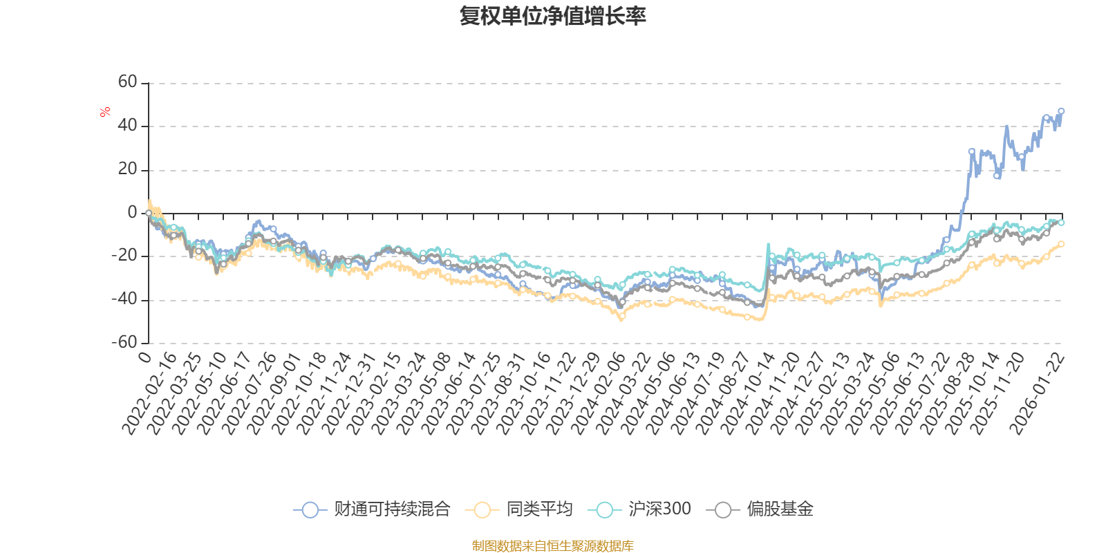 截至1月22日,财通可持续混合近三个月复权单位净值增长率为19.47%,位于同类可比基金44/621;近半年复权单位净值增长率为67.55%,位于同类可比基金20/621;近一年复权单位净值增长率为77.62%,位于同类可比基金37/613;近三年复权单位净值增长率为76.98%,位于同类可比基金28/535。