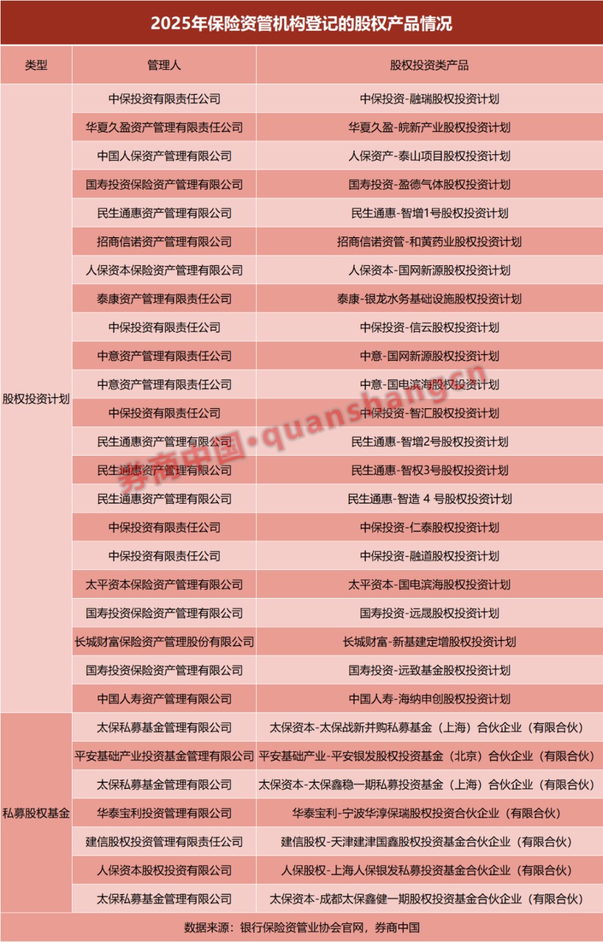 上述投资也是险资加力探索股权投资的延续。据券商中国记者梳理,2025年,保险资管机构共登记股权投资计划22只,股权计划登记规模335.32亿元;登记私募股权基金7只,登记规模350.06亿元。