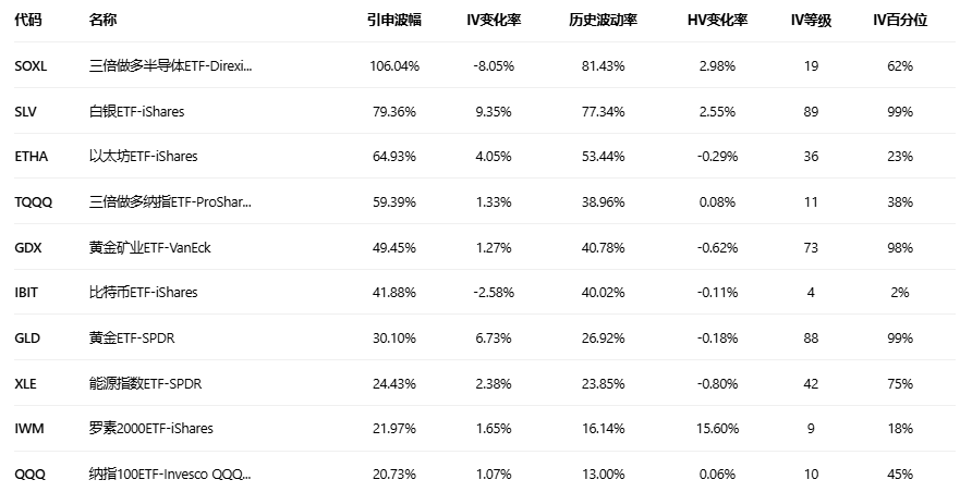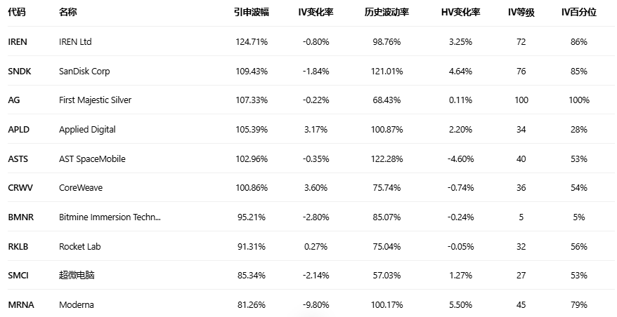 引申波幅排行榜(标的市值>10亿美元,且期权成交量>10万)
