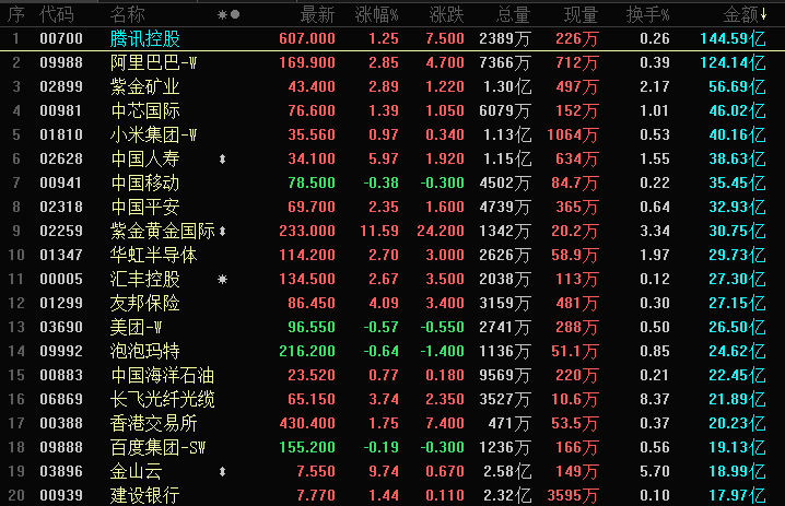 盘面上,权重科技股走势继续分化;保险股、银行股拉升走强助力大市回暖,其中中国人寿涨近6%,工商银行、农业银行、建设银行皆有涨幅,汇丰控股再创历史新高;黄金股部分继续上涨,紫金矿业、紫金黄金国际均大涨再创历史新高;重型机械股继续活跃,中国重汽、三一国际齐创新高;光伏股、苹果概念股、港口及海运股、AI应用概念股普遍上涨。