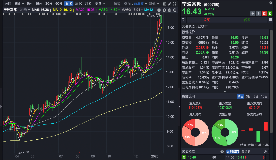 截至1月27日收盘,宁波富邦股价为16.43元/股,总市值22亿元。