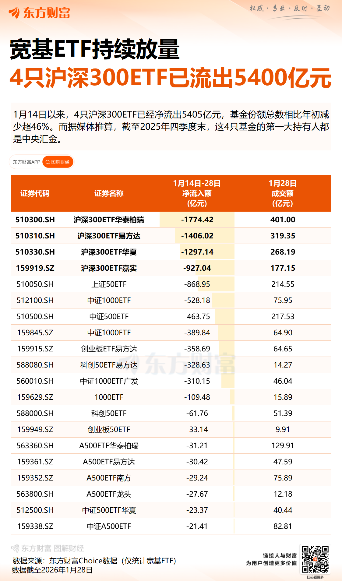 Wind数据显示,1月28日,华泰柏瑞基金、易方达基金、华夏基金、嘉实基金旗下沪深300ETF合计净流出超970亿元,今年以来合计净流出超5400亿元,基金份额总数相比年初减少超46%。