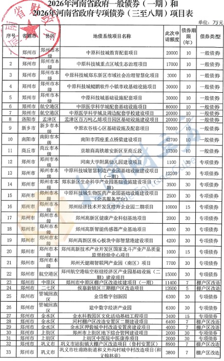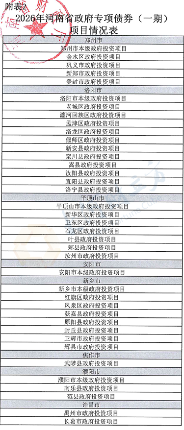 2026年河南省政府一般债券(一期)、2026年河南省政府专项债券(一期)、2026年河南省政府专项债券(二期)、2026年河南省政府专项债券(三至八期)用于项目建设。
