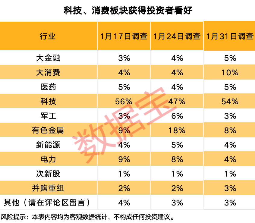 从板块来看,科技板块下周较受欢迎,54%的受访者表示看好,环比提升7个百分点;大消费板块占比10%,环比提升6个百分点。近期资金热捧的有色金属板块热度有所减退,占比环比下降10个百分点至8%。从概念角度来看,人工智能、存储芯片、商业航天/卫星互联网、大消费及零售最被看好,占比依次为21%、18%、13%、12%。