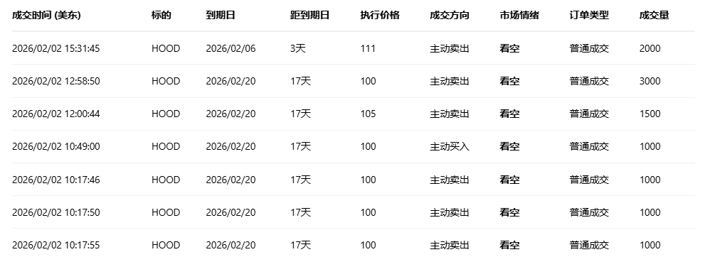Robinhood收跌9.62%,成交55.58万份期权合约,看跌/看涨成交量比降至0.54。Robinhood股价暴跌约10%至88美元创七个月新低,主要受比特币跌至10个月低点和加密货币交易量下滑影响,同时分析师指出美式足球赛季结束将冲击其预测市场业务收入。