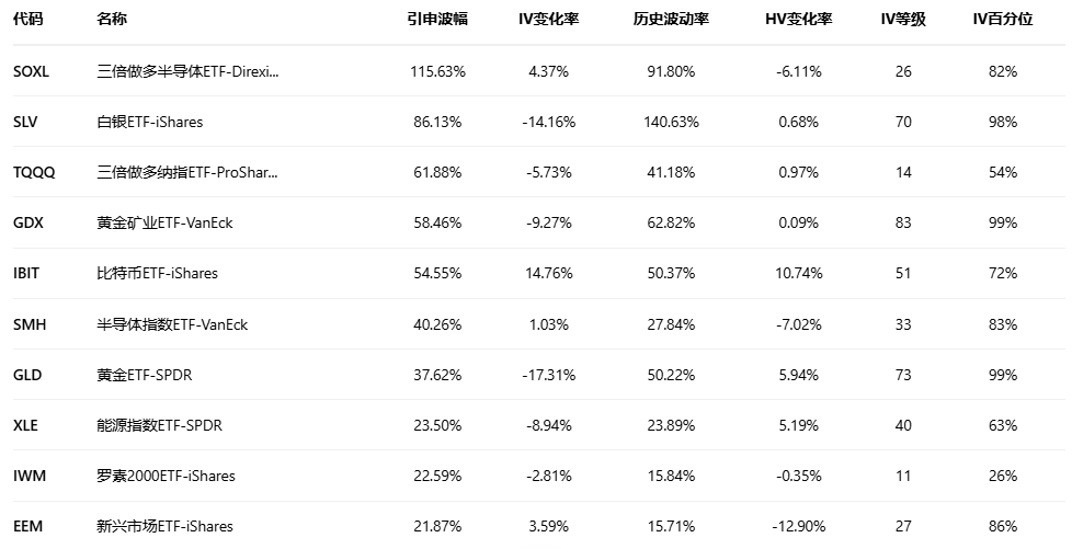 引申波幅排行榜(标的市值>10亿美元,且期权成交量>10万)
