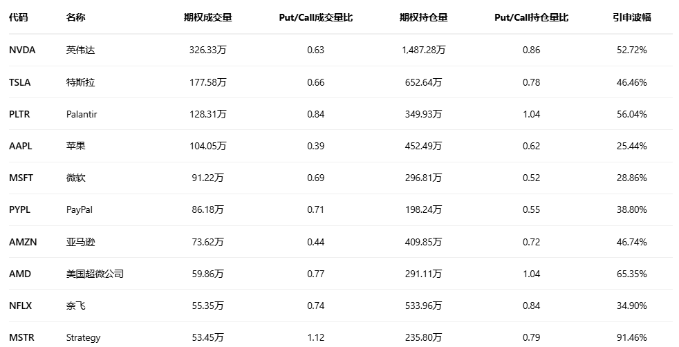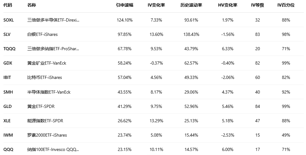 引申波幅排行榜(标的市值>10亿美元,且期权成交量>10万)