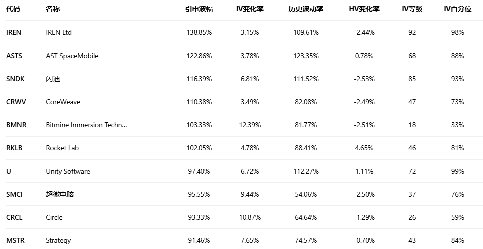 IREN Ltd隐含波动率最高,达到138.85%,较上一交易日增长3.15%。IREN与微软签署97亿美元云服务协议从比特币挖矿转向AI基础设施,但股价因比特币跌破75000美元而下跌6%,分析师目标价94.84美元认为被低估44%。