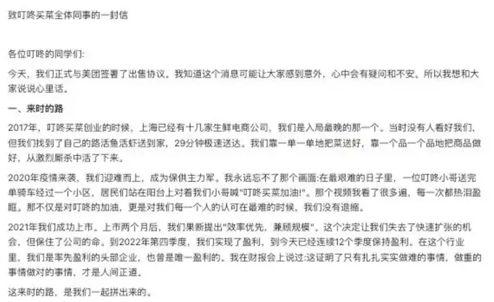 在信的最后,梁昌霖深情回顾了自己来上海23年、从程序员到创业者的历程,并将叮咚买菜(DDL)的8年多称为其创业生涯中“最骄傲的时刻”。他强调,这份骄傲并非源于上市或盈利,而是来自每一位在疫情中坚守的配送小哥、凌晨工作的分拣员、精益求精的商品开发人员以及默默优化的工程师。