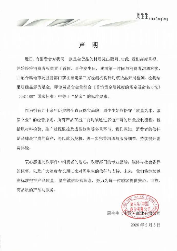 随着舆论升温,周生生官方微博先于2月3日午间发布情况说明,表示高度重视顾客反映的相关事宜,正积极开展相关工作。当日晚间,其微博继续发声,出示了当时出厂批次的破坏性检测报告,报告显示该批次货品质量完全符合国家相关标准;同时,周生生将同批次同款福袋送检,检测结论为足金饰品。