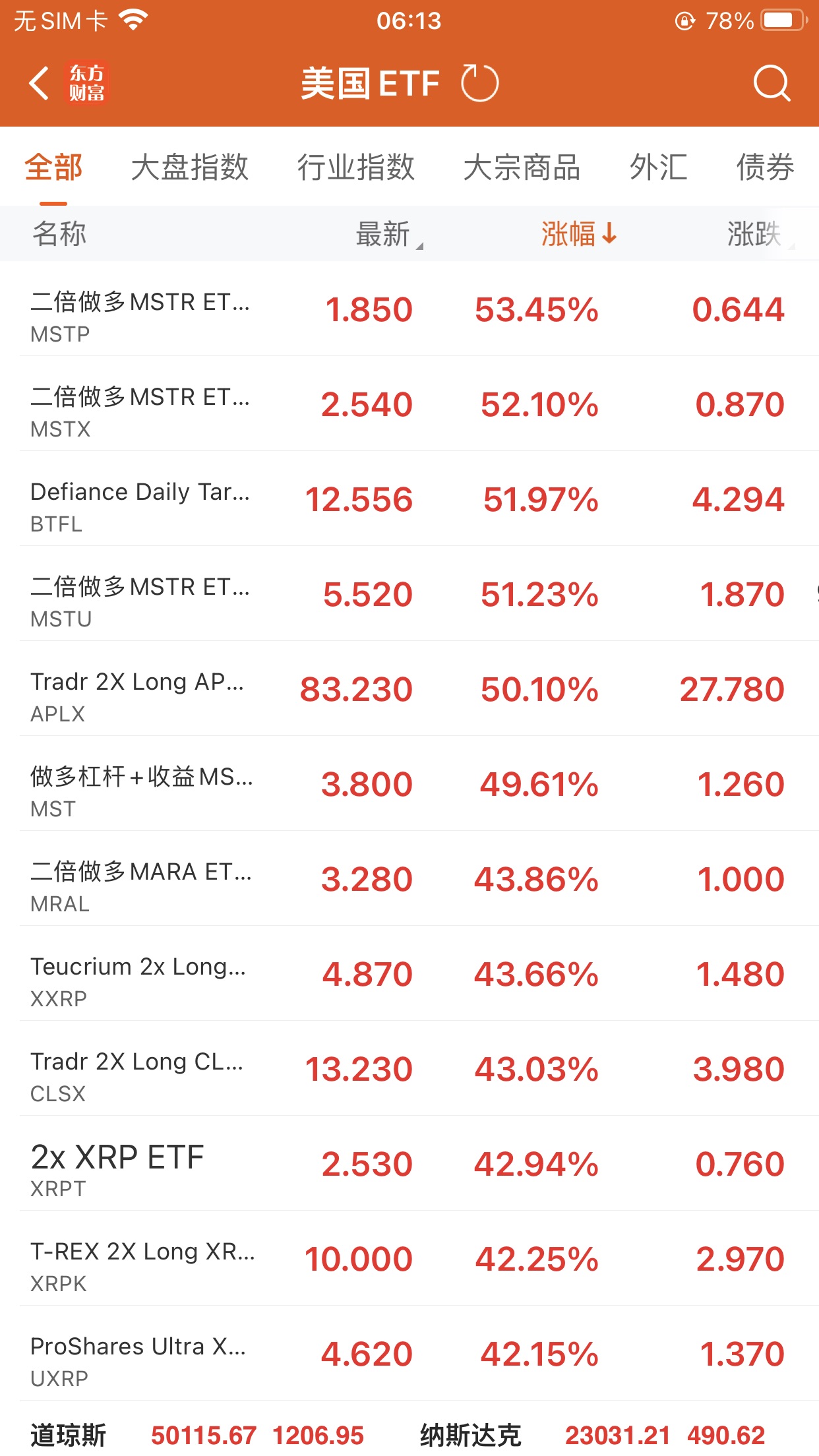 2倍做多MSTR ETF-T-Rex(MSTU.US) 升 51.23%,成交额 4.63 亿美元。