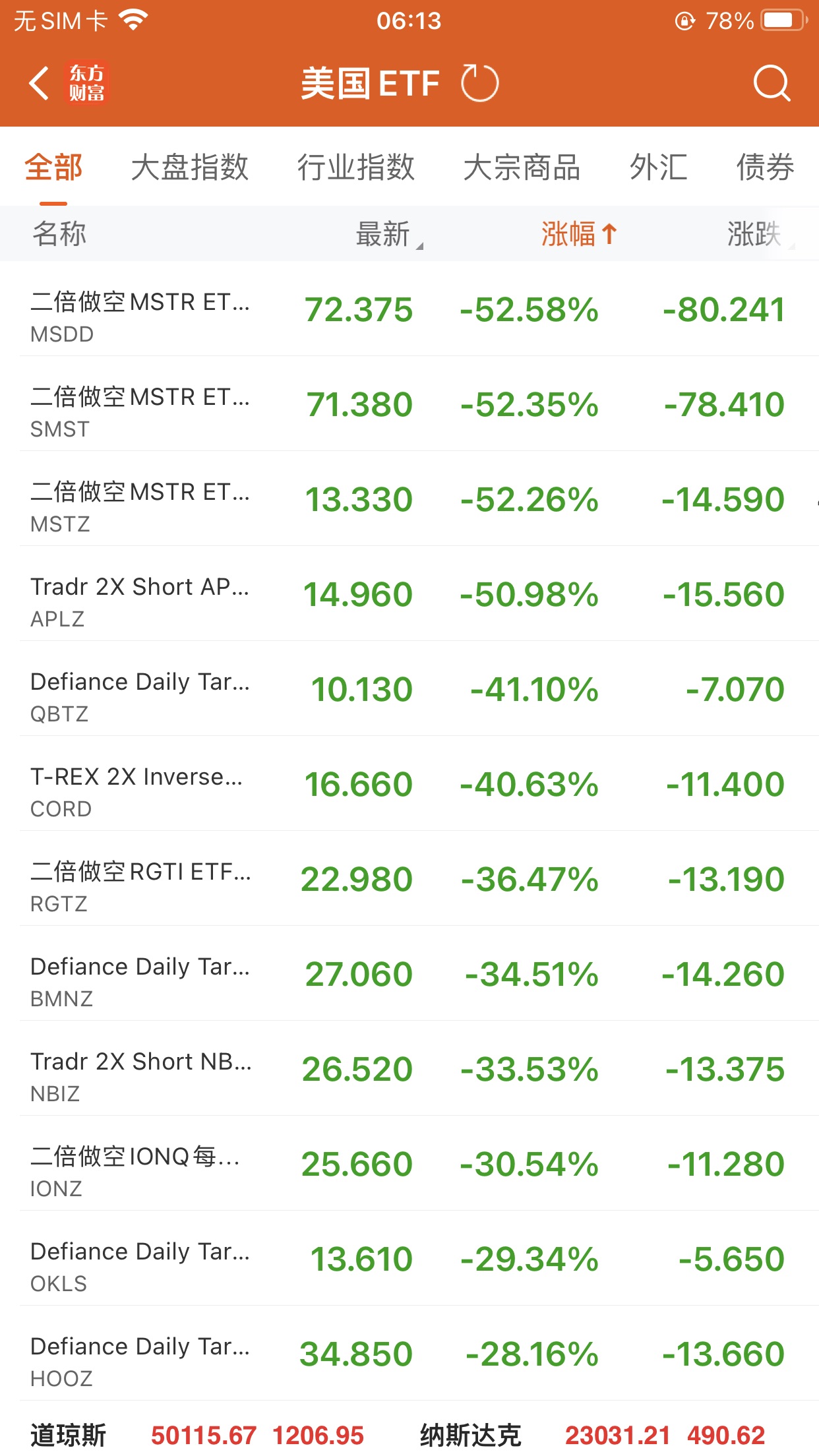 2倍做空MSTR ETF-T-Rex(MSTZ.US) 跌 52.26%,成交额 6.57 亿美元。