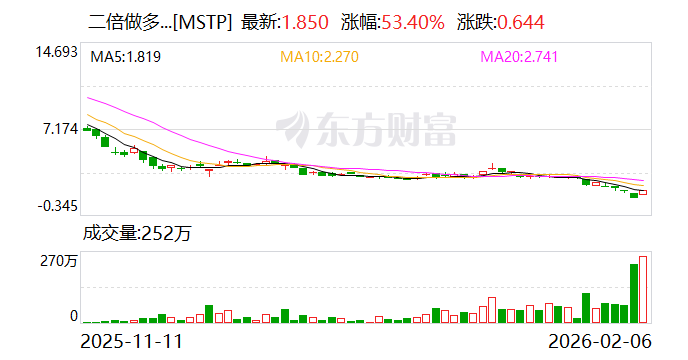 2倍做多MSTR ETF-GraniteShares(MSTP.US) 升 53.45%,成交额 410.16 万美元。