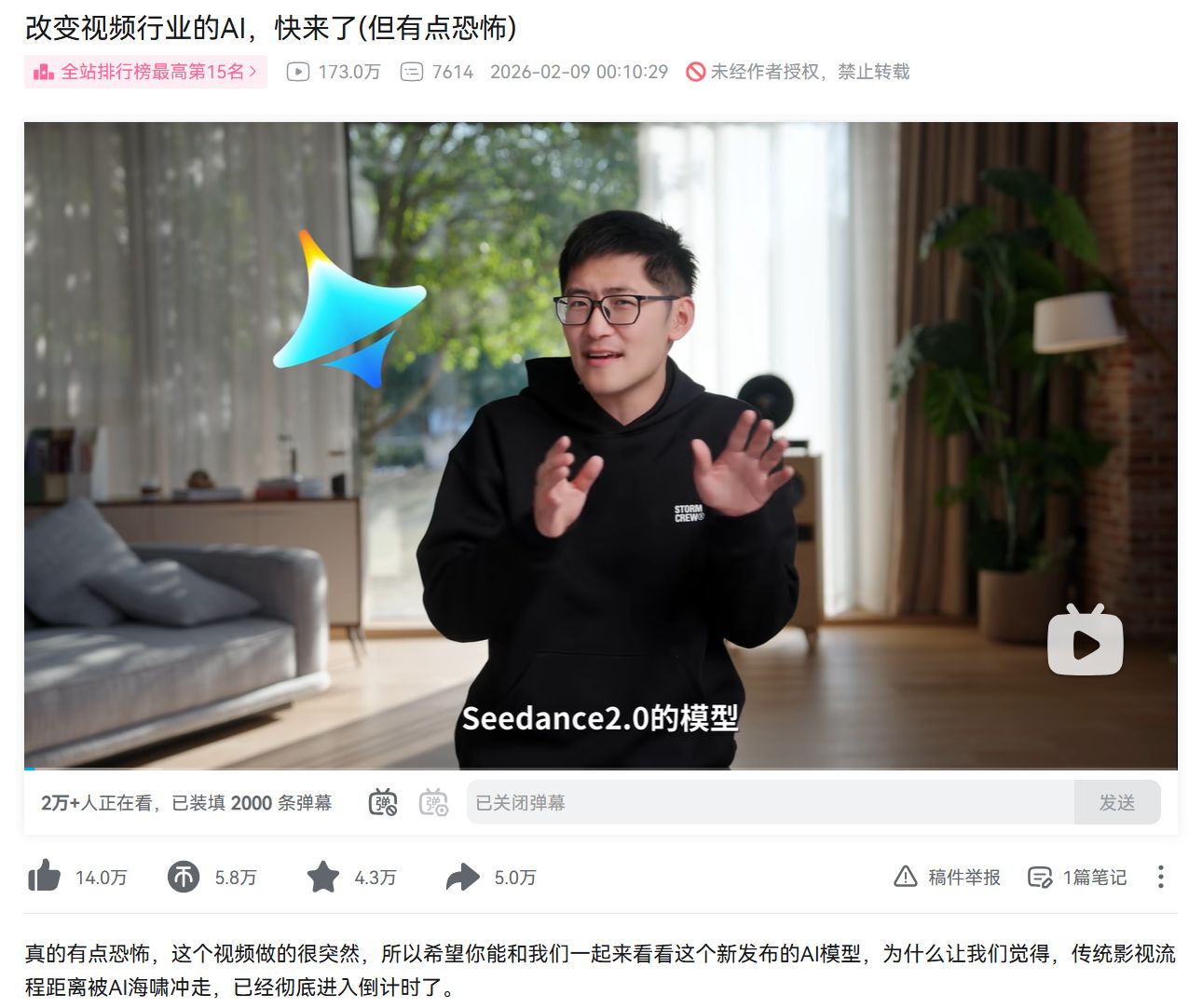 值得一提的是,从字节视频模型Seedance2.0的测评效果,冯骥在微博中也提及:“AI理解多模态信息(文、画、影、音)并整合的能力完成了一次飞跃,令人惊叹。”