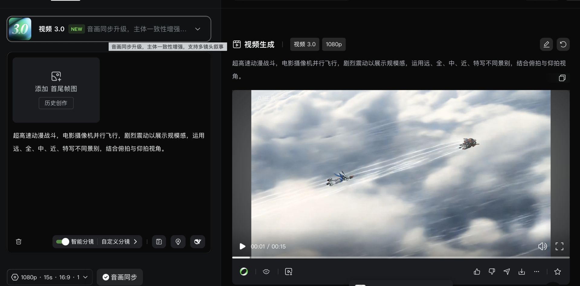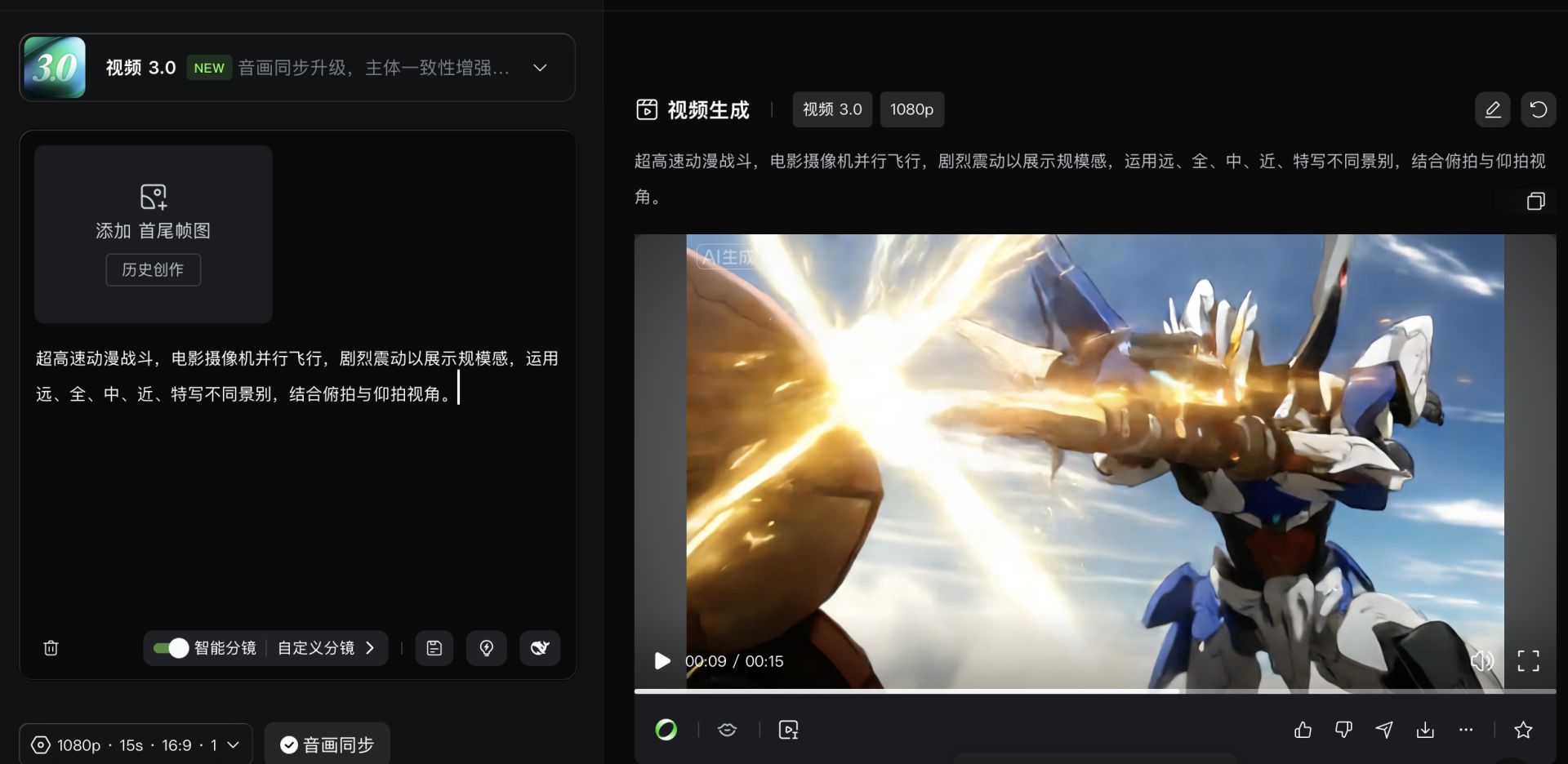 第二步:用“视频3.0”实现动态化。将上图作为“图生视频+主体参考”输入,通过“自定义分镜”功能精确规划每个镜头的时长、景别,生成一段有叙事节奏的动态视频。