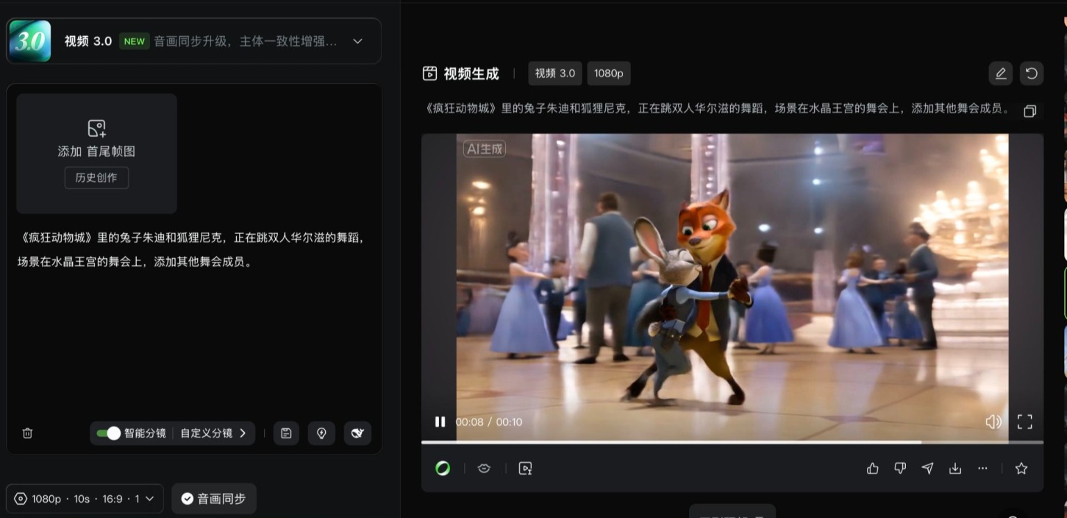 每经记者将此前实测可灵AI 2.6模型时使用的同一提示词——“《疯狂动物城》里的兔子朱迪和狐狸尼克,正在跳双人华尔兹的舞蹈,场景在水晶王宫的舞会上,添加其他舞会成员”输入至3.0模型进行了对比测试。结果发现,3.0模型在一致性提升方面相对明显。