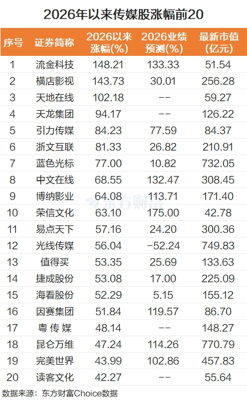 涨幅前20个股中,流金科技、中文在线、博纳影业、荣信文化、因赛集团、昆仑万维、完美世界,机构预测2026年业绩将翻倍增长。