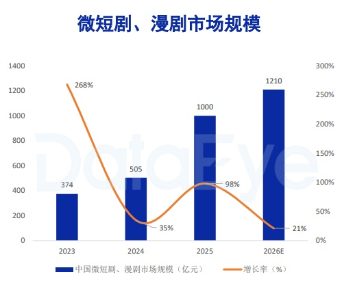 DataEye研究院表示,2025年中国微短剧、漫剧全年产值达千亿,这一数值大幅超出此前600亿元左右的市场预期。同期全国电影总票房为518.32亿元,微短剧、漫剧市场体量已接近电影票房的两倍。该机构预测,2026年中国微短剧、漫剧市场规模保守估计将突破1200亿。
