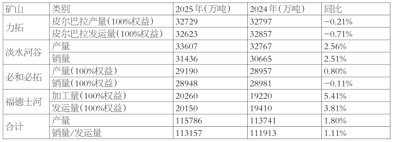 2025年,福德士河(Fortescue)产量为2.03亿吨,同比增长5.41%;销量为2.02亿吨,同比增长3.81%。