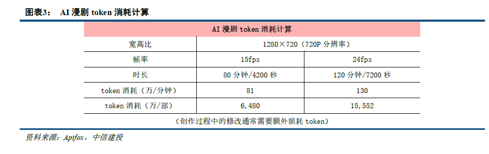 普通动态漫创作通常需要消耗过亿token。动态漫常用的视频格式是1)720p分辨率,2)宽高比为1280×720,3)15fps的低帧率(正常为24fps)。静态漫转动态漫、沙雕漫、普通和高品质漫剧等不同的类型AI漫剧对上述参数的要求不同,所以每分钟token消耗存在差异。根据上述公式计算,对于静态漫转动态漫、沙雕漫等消耗量较少的AI漫剧,每分钟视频生成需要约50万token,而对于高品质AI动态漫,每分钟需要消耗数百万token。此外,一部漫剧成品需要反复修改,所以创作过程中,实际的视频生成时间不止80-120分钟。综合以上计算,通常创作一部普通动态漫需要消耗上亿token。