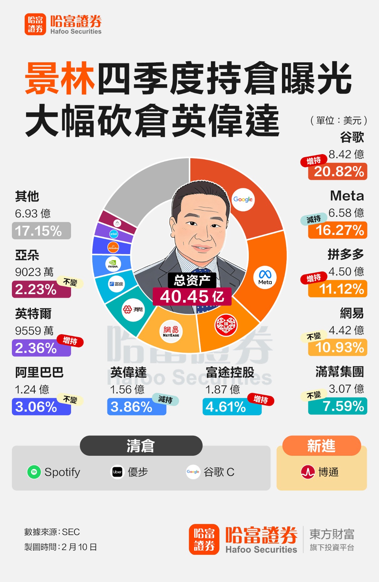 具体来看,景林香港2025四季度共计持仓28只股票,前十大重仓股中谷歌、Meta居前两位,持仓市值分别为8.42亿美元和6.58亿美元,占比20.82%和16.27%,另外还有两大知名美股英伟达和英特尔,分别持仓1.56亿美元和9559万美元。除此之外,前十大持仓中还有6个中概股,分别是拼多多、网易、满帮集团、富途控股、阿里巴巴和亚朵,持仓市值在4.5亿美元至9023万美元不等。
