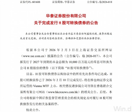2月10日晚间,华泰证券披露,此前公告拟发行的2027年到期、本金总额100亿港元的H股零息可转换债券,其认购协议项下所有先决条件均已达成,并于当日完成发行,该债券将在维也纳证券交易所运营的Vienna MTF挂牌上市。