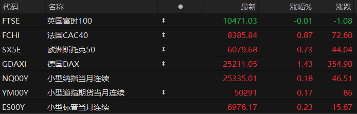 周四盘前,美股三大股指期货齐涨,欧洲主要指数多数上涨。截至发稿,纳斯达克100指数期货涨0.18%,道指期货涨0.17%,标普500指数期货涨0.23%。