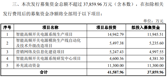 本次发行募集资金总额不超过3.79亿元,扣除相关发行费用后的募集资金净额将全部用于智能高频开关电源系统生产项目、智能高频开关电源模块生产线自动化及技术升级改造项目、营销网络及信息化建设项目、智能高频开关电源系统研发中心项目、补充流动资金。