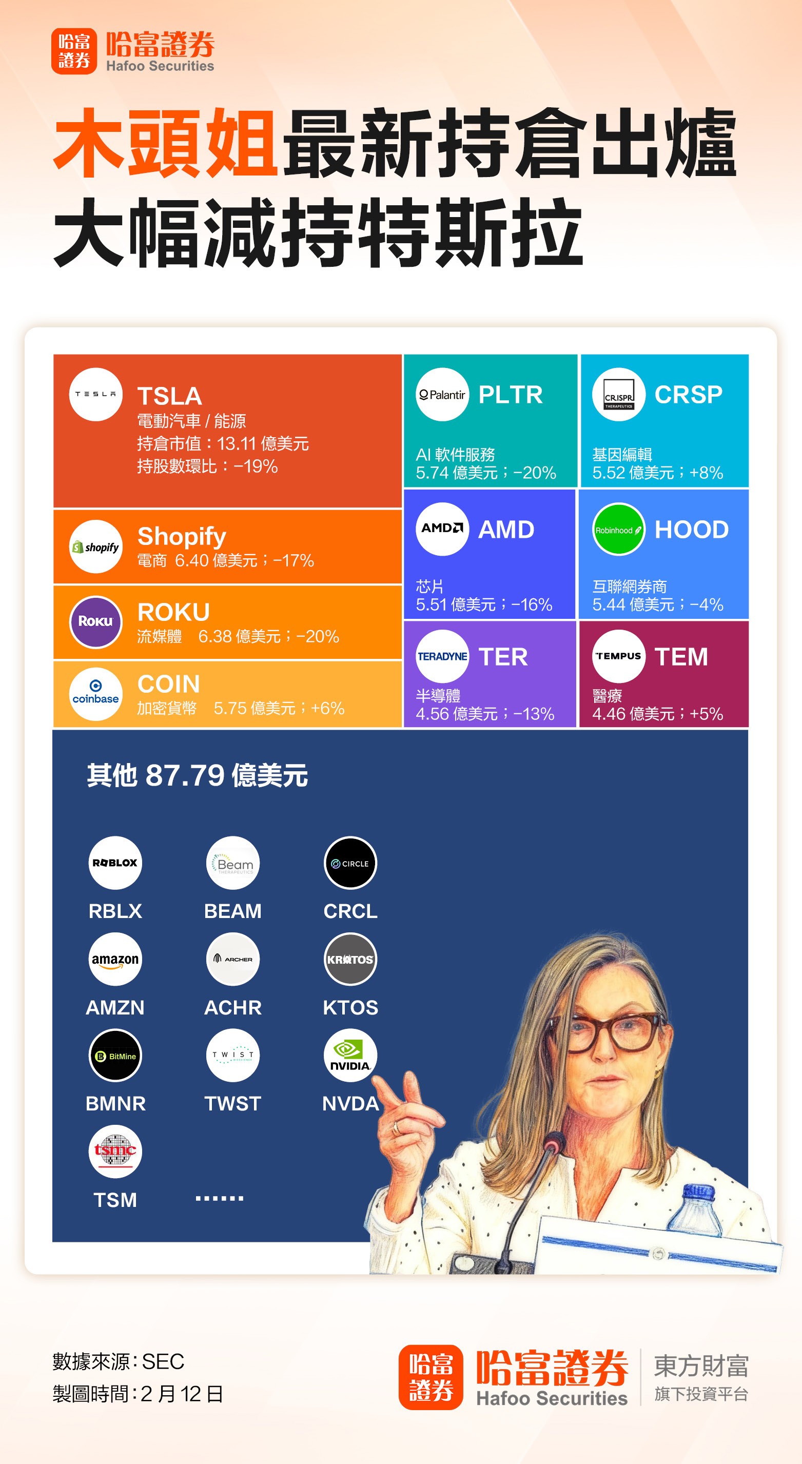 日前,有“女版巴菲特”之称的知名投资人“木头姐”凯茜·伍德(Cathie Wood)旗下的方舟投资向美国SEC提交13F文件,披露了截至2025年四季度末的美股持仓情况:持仓市值150.67亿美元,环比上季度减少约17亿美元;对比2024年末的120亿美元持仓,2025年全年增长了约30亿美元。