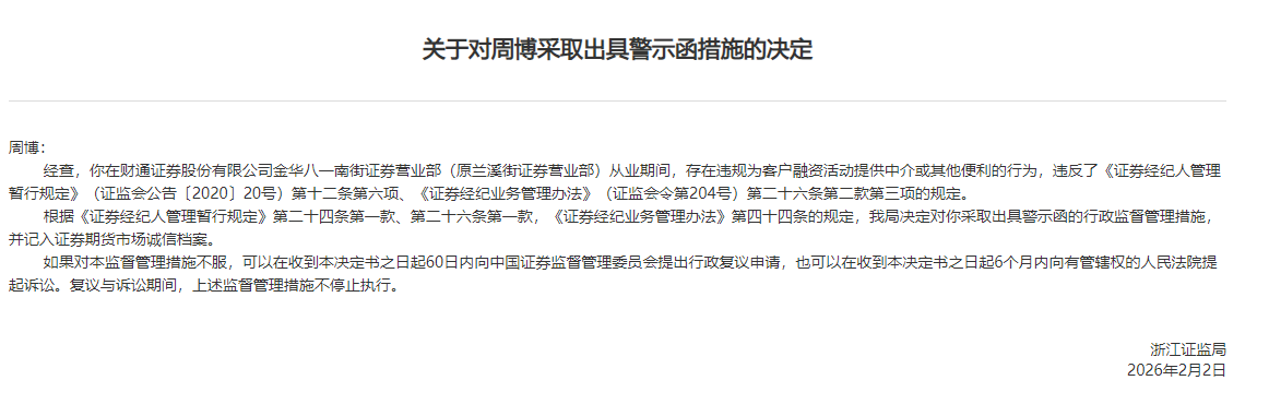 2月13日,浙江证监局官网显示,该局近日对周博采取了出具警示函措施的决定。