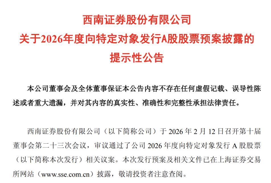 2月13日晚间,西南证券发布公告称,公司拟向特定对象发行A股股票,募集资金总额不超过60亿元,将全部用于补充公司资本金,加码财富管理、投行、资管等核心业务。