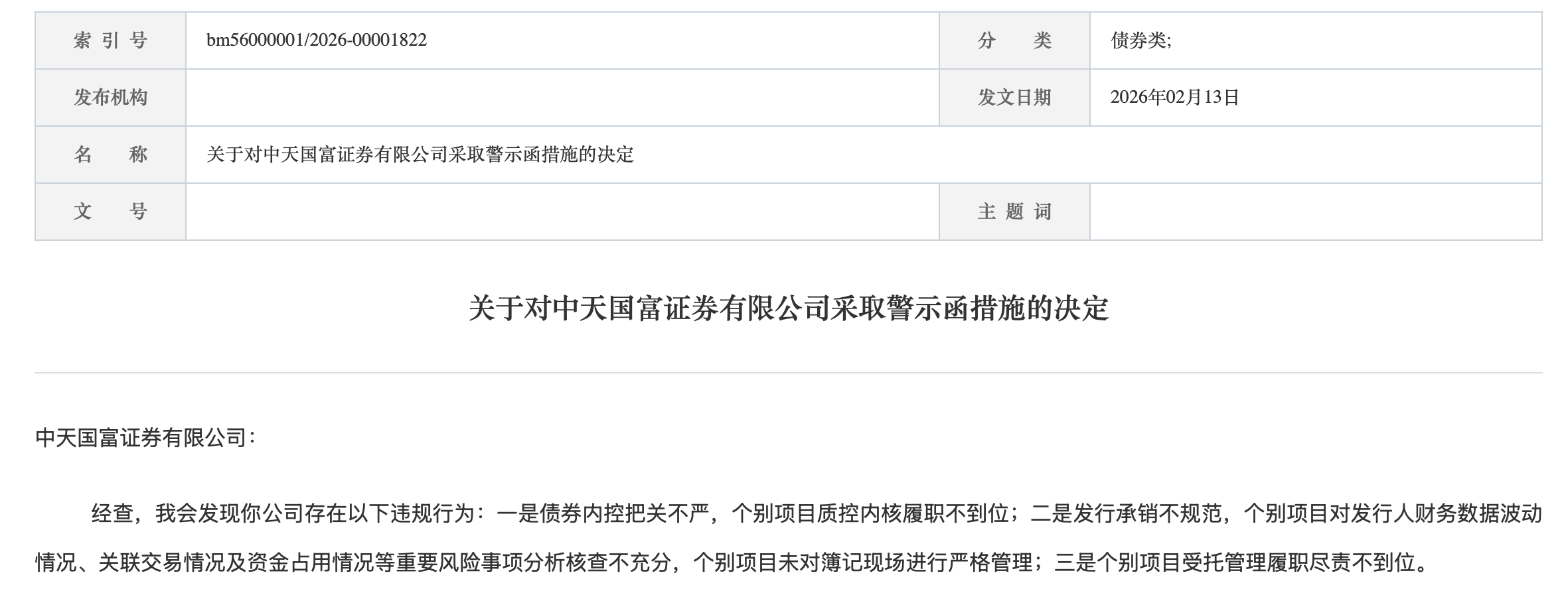 2月13日,证监会发布关于对中天国富证券有限公司采取警示函措施的决定,经查,证监会发现公司存在以下违规行为: