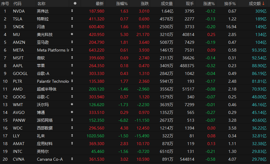 第4名美光收高5.3%,成交133.64亿美元。英伟达周三宣布,美光科技旗下忆恒创源(Persistent)借助英伟达BioNeMo和NeMo Agent工具包加速由人工智能驱动的分子发现进程。